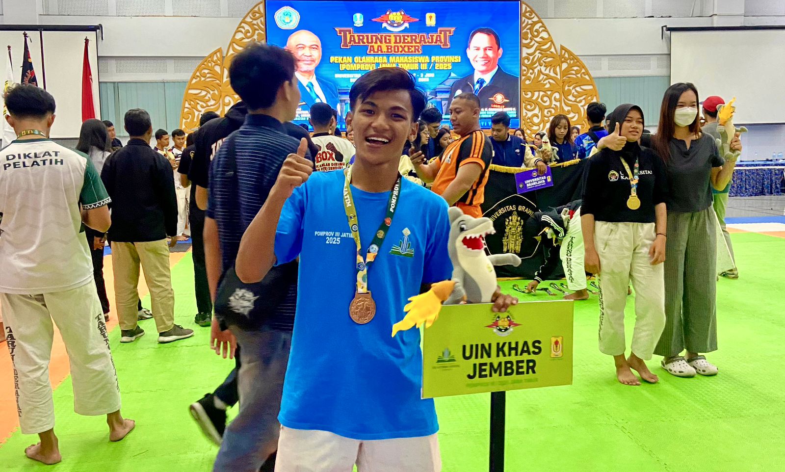 MEDICEN FADA - Prestasi membanggakan kembali ditorehkan oleh mahasiswa Fakultas Dakwah Universitas Islam Negeri Kiai Haji Achmad Siddiq (UIN KHAS) Jember. Dalam ajang Pekan Olahraga Mahasiswa Provinsi (POMPROV) Jawa Timur III, M. Alawy Farhan Yahya, mahasiswa semester 2 Program Studi Komunikasi dan Penyiaran Islam (KPI), berhasil meraih medali perunggu pada cabang olahraga (cabor) Tarung Derajat.