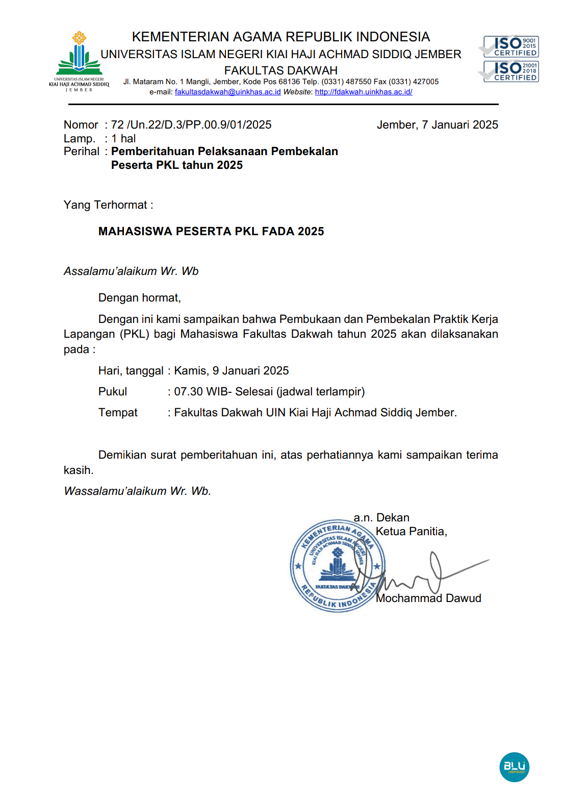 Lapangan (PKL) bagi Mahasiswa Fakultas Dakwah tahun 2025 akan dilaksanakan pada :