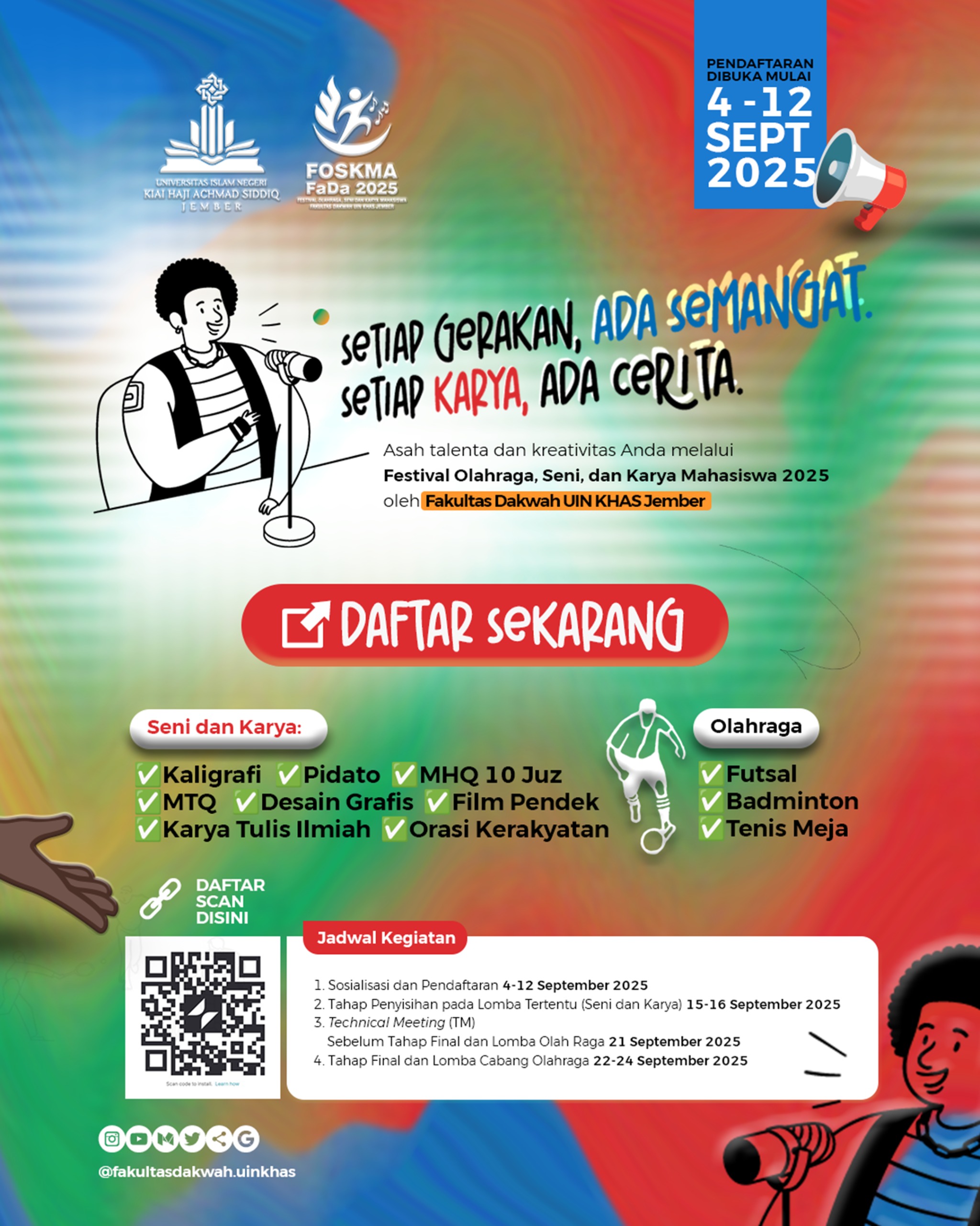Dalam rangka meningkatkan prestasi mahasiswa Fakultas Dakwah UIN KHAS Jember, dibidang Olahraga, Seni dan karya, maka akan dilaksanakan kegiatan Festival Olahraga, Seni dan Karya Mahasiswa (FOSKMA) Tahun 2025, diselenggarakan oleh Fakultas Dakwah UIN KHAS Jember. Lebih lengkapnya silahkan download >>disini<<