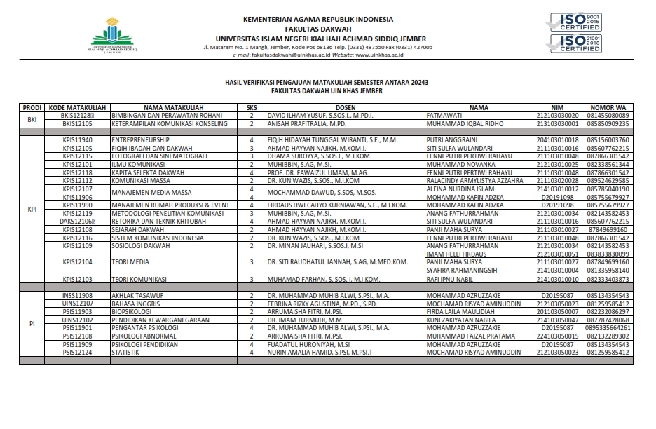 Diumumkan kepada mahasiswa Fakultas Dakwah yang menempuh Mata Kuliah Semester Antara, berikut daftar hasil Hasil Verifikasi Pengajuan Mata Kuliah Semester Antara 20243 >>>PENGUMUMAN<<<