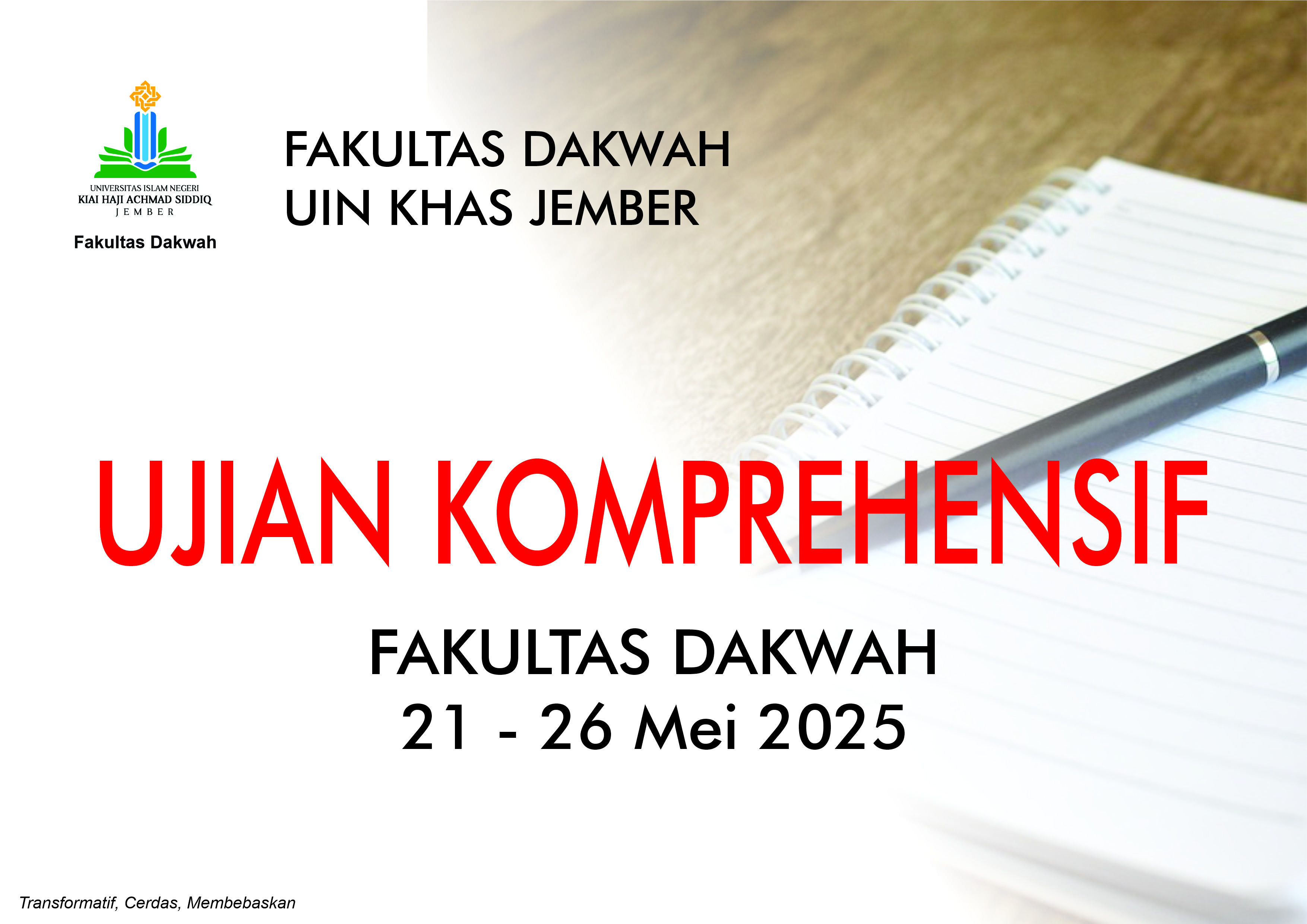 Disampaikan kepada mahasiswa Fakultas Dakwah UIN Kiai Haji Achmad Siddiq Jember, bahwa Ujian Komprehensif akan dilaksanakan pada tanggal 21-26 Mei tahun 2025. Informasi selengkapnya klik <<DISINI>>