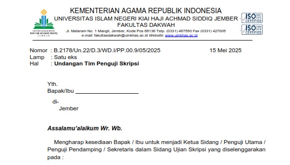 Disampaikan kepada Bapak/Ibu Dosen dan Mahasiswa Fakultas Dakwah UIN KHAS Jember, bahwa Ujian Skripsi dilaksanakan pada hari Rabu-Kamis, Tanggal 21-22 Mei 2025, Informasi selengkapnya klik <<DISINI>>