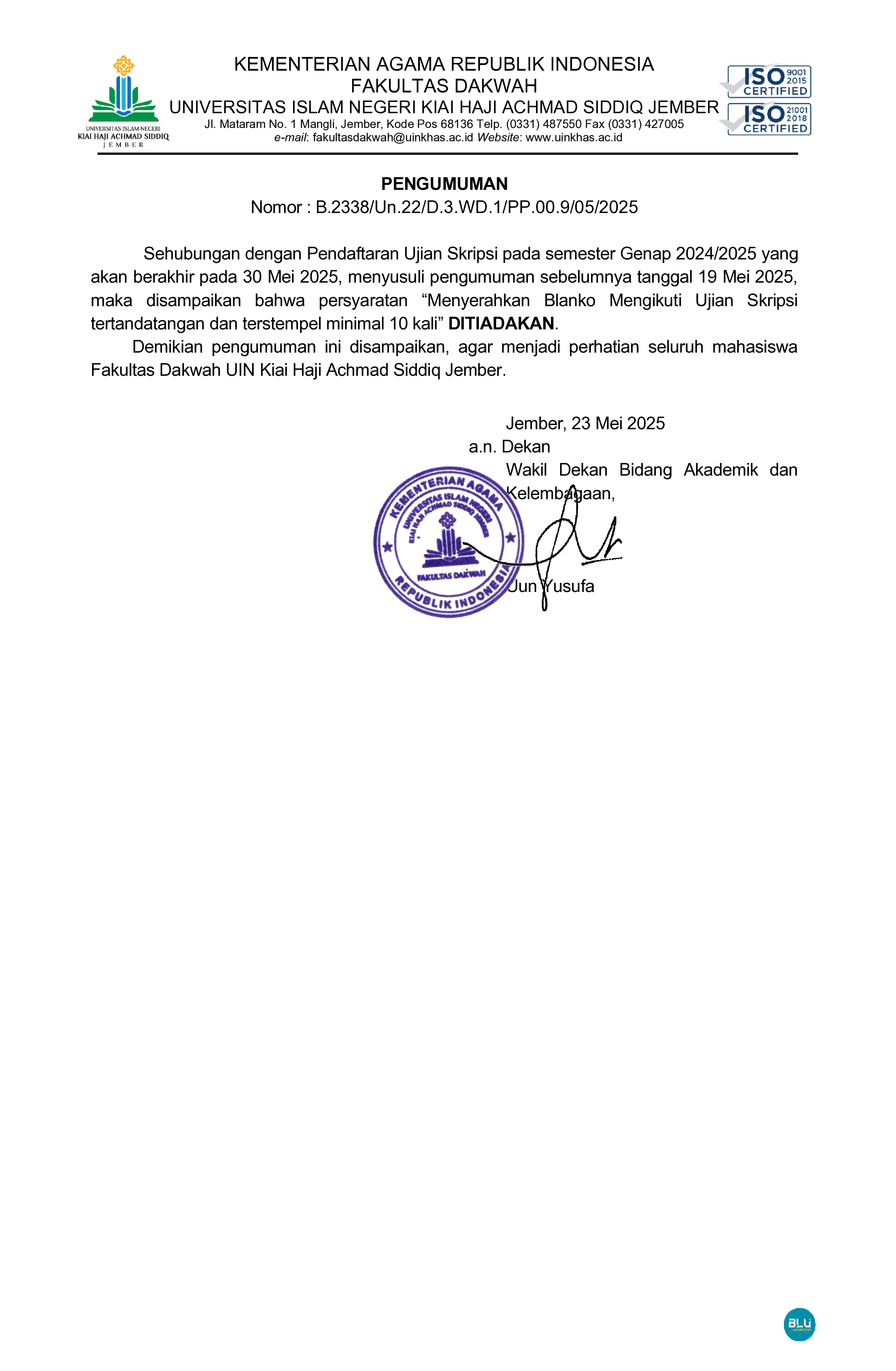 PENGUMUMAN PENGHAPUSAN SALAH SATU PERSYARATAN UJIAN SKRIPSI