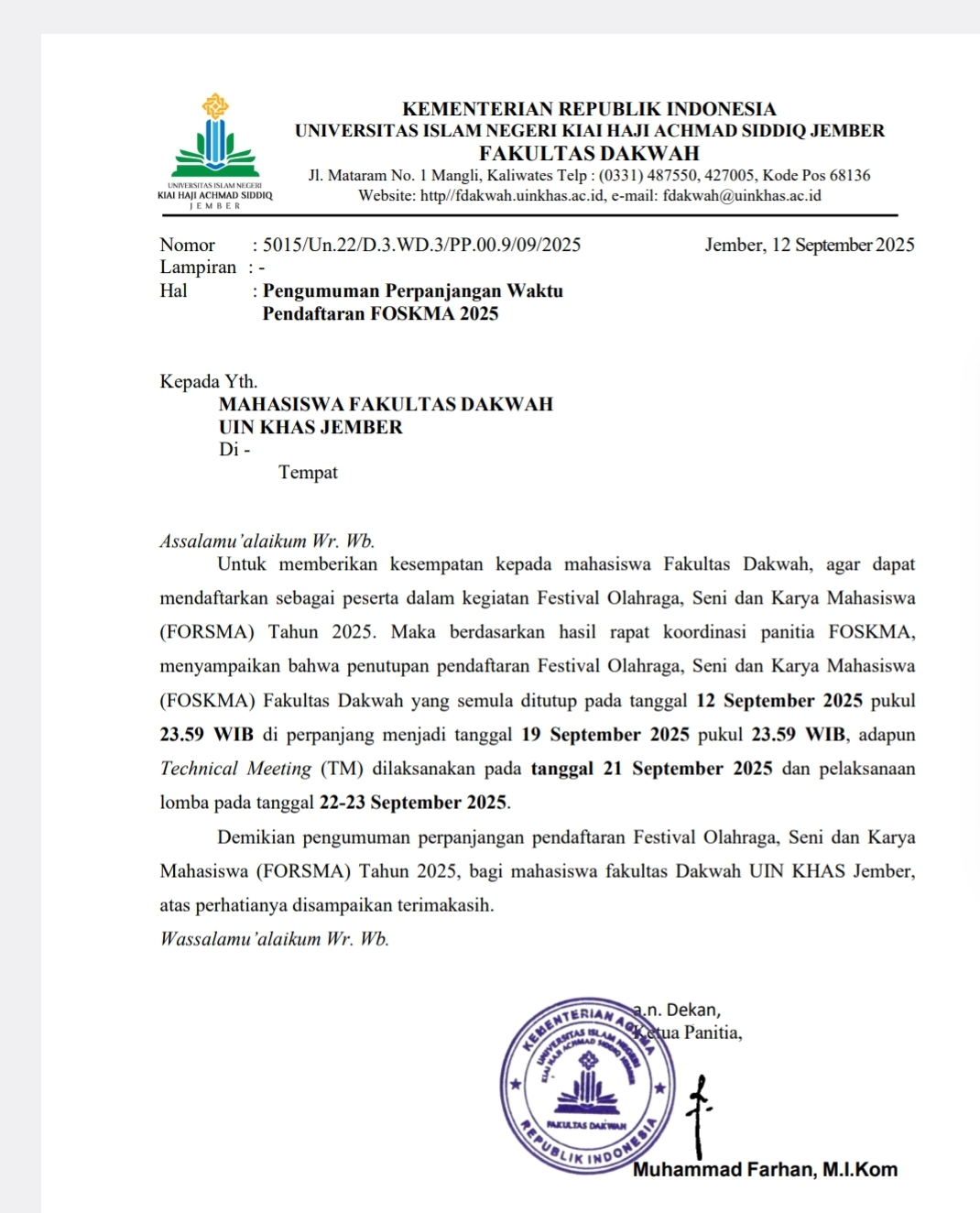 Disampaikan kepada seluruh mabasiswa.dakwah, bahwa informasi pendaftaran FOSKMA 2025 diperpanjang. Informasi selengkapnya baca PENGUMUMAN.