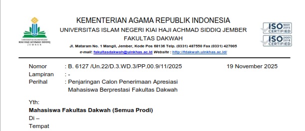 Sehubungan dengan akan dilaksanakan pemberian apresiasi bagi mahasiswa berprestasi (tingkat Regional, Nasional dan Internasional), maka perlu dilakukan penjaringan kepada seluruh mahasiswa di lingkungan Fakultas Dakwah UIN KHAS Jember sebagai calon penerima penghargaan pada Malam Penganugerahan dari Rektor UIN KHAS Jember. Informasi selengkapnya baca >>>PENGUMUMAN<<<<